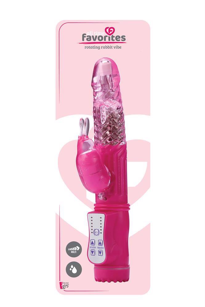 This duo vibrator has a lot of features for exciting moments. Apart from multispeed vibrations it has a rabbit with clit tickling ears, and it has a rotating function because the beads inside the shaft can rotate. All functions can be operated easily with the buttons at the base. The All Time Favorites rotating duo vibrator is made of TPE and ABS. It is Phthalate free and body safe. Rotating duo vibratorWith rotating pleasure beads in the shaftVibrating rabbit clitoris stimulatorWaterproofRequires 4 x AAA batteries, not included