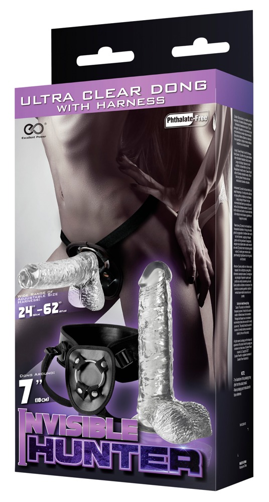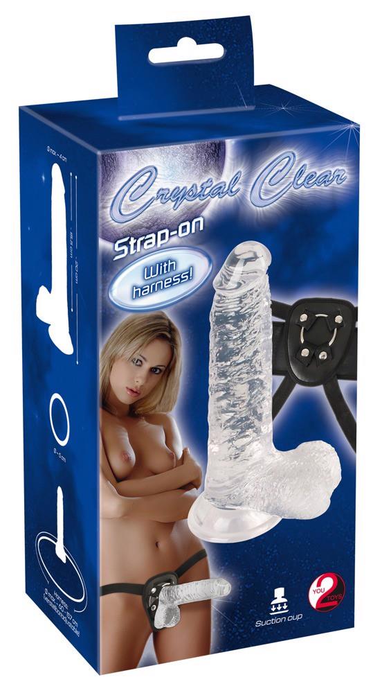 Strap on and enjoy! Transparent penis-shaped dildo with testicle and a suction cup. The dildo can be placed in the ring on the black strap-on harness (circumference 60-157 cm). The harness has adjustable straps. Dildo: 20 cm long, insertion depth 15 cm , Ø 3.2-4 cm. Tip: the dildo can also be used on its own!Material: PVC, polyurethane (harness).