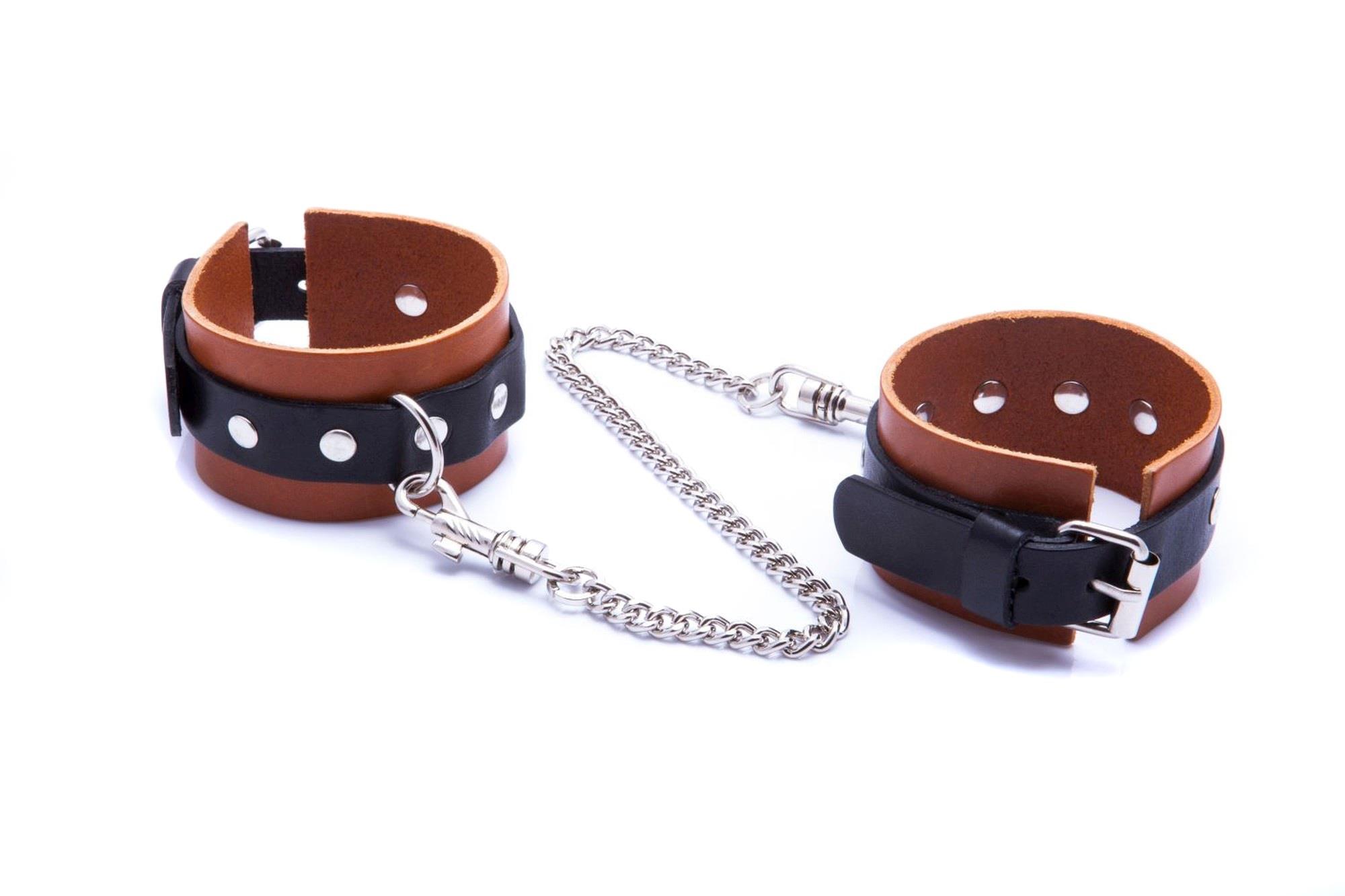 Skórzane kajdanki męskie na ręce w kolorze koniakowym zapinane na masywne klamry. Możliwość regulacji rozmiaru.Polski producentSzerokość mankietów: 4cm Długość łańcuszka- ok. 30cmProdukt został wykonany bardzo starannie z naturalnej skóry bydlęcej. Skóra ta wyprawiana jest metodą tradycyjną, garbnikami roślinnymi w najstarszej czynnej w Polsce garbarni. Skóra ta jest bardzo mocna, a jednocześnie delikatna w dotyku, a ponadto charakteryzuje si ę ekscytującym zapachem. Posiada unikatową cechę dostosowywania się do kształtu ciała i z biegiem czasu nabiera szlachetności. Produkt bardzo dobry gatunkowo.Opakowanie: eleganckie kartonowe pudełko.
