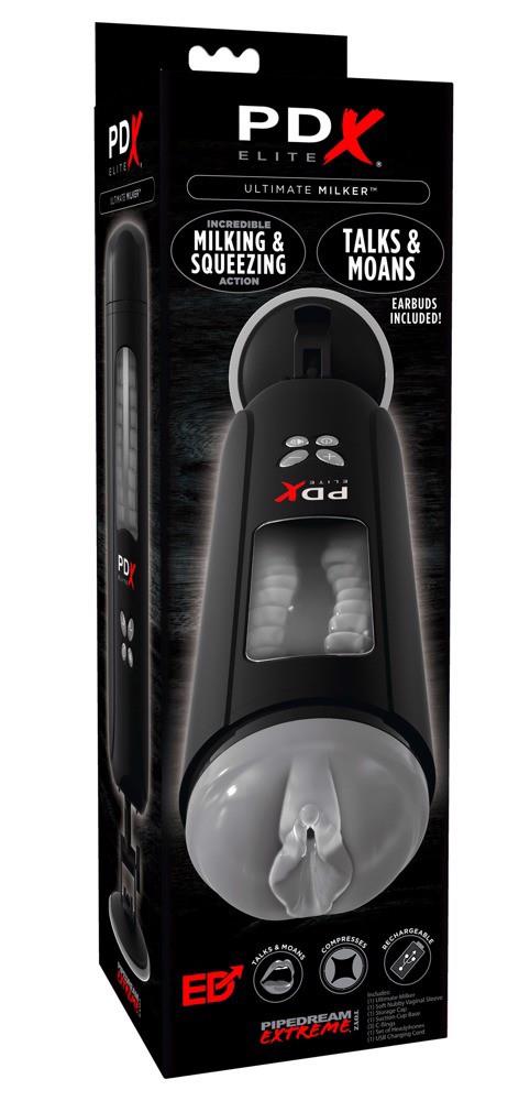 With suction cup for a hands-free sensation!Black masturbator with 10 milking functions and 5 speeds. It has a sound function that offers various moans and phrases and works with the included headphones. The removable sleeve has stimulating grooves and dots on the inside. Clear window to watch oneself and LED light. With suction cup, 3 cock rings and a USB charging cable.Complete length 26.9 cm, penetration depth 12 cm, Ø opening 1.5-4.8 cm. ABS, TPE.