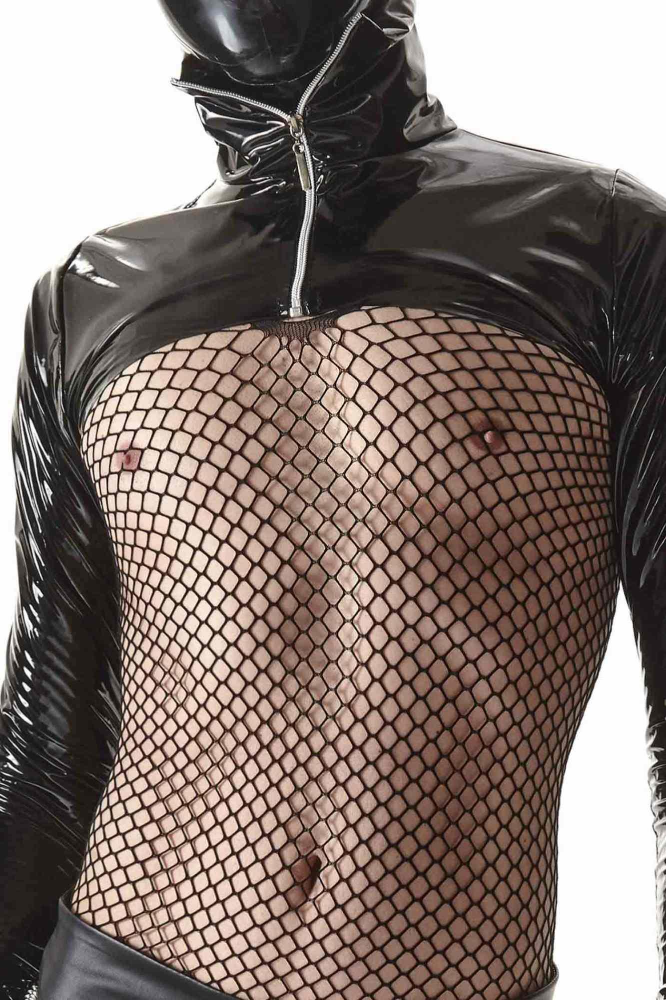 Kurtka wykonana w całości  z metalicznie błyszczącego materiału. Dedykowana do pikantnych zabaw i stylizacji z latexowymi maseczkami. Efektownie odkrywa plecy i brzuch, ukazując linię sylwetki. Uwagę przykuwa wysoki kołnierz z ozdobnym srebrnym ekspresem.