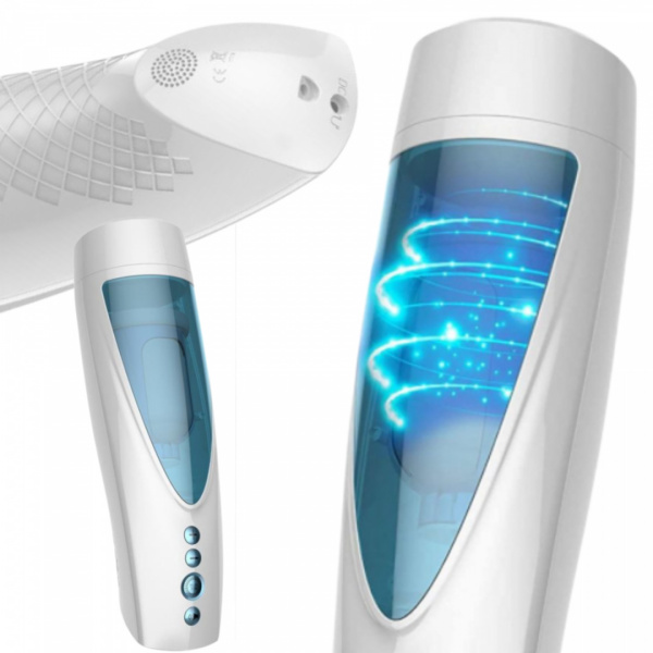 1) Krótko naciśnij duży przycisk zasilania, aby włączyć masturbator. Podświetla się panel sterowania i zabawka przejdzie w stan gotowości. Kolejne krótkie naciśnięcie włączy pierwszy tryb funkcji. Każde krótkie naciśnięcie zmienia funkcję masażera, przechodząc przez jego 10 trybów funkcji.