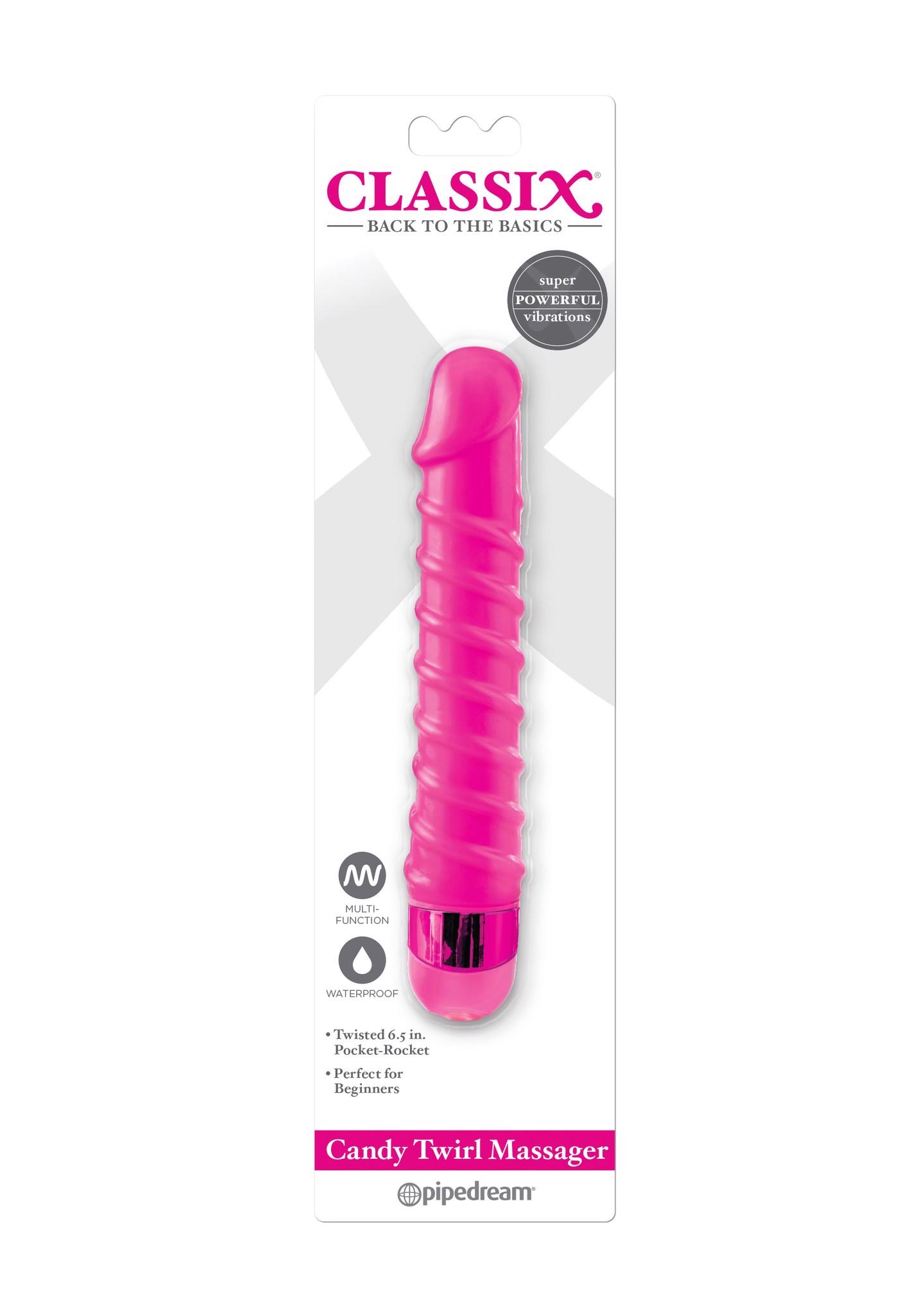 Classix Candy Twirl Massager Perfect for first-timers, this Twisted multi-speed pocket-rocket will give you mind-blowing satisfaction that is out of this world! Made from super-smooth TPR, the ribbed shaft offers incredible stimulation while the multi-speed dial at the base takes you from a flutter to a throb in an instant. Simply hold the button down to turn off. The compact, waterproof design can be enjoyed in the shower or spa! • Multi-Speed • Waterproof • Requires 2 ‘AAA’